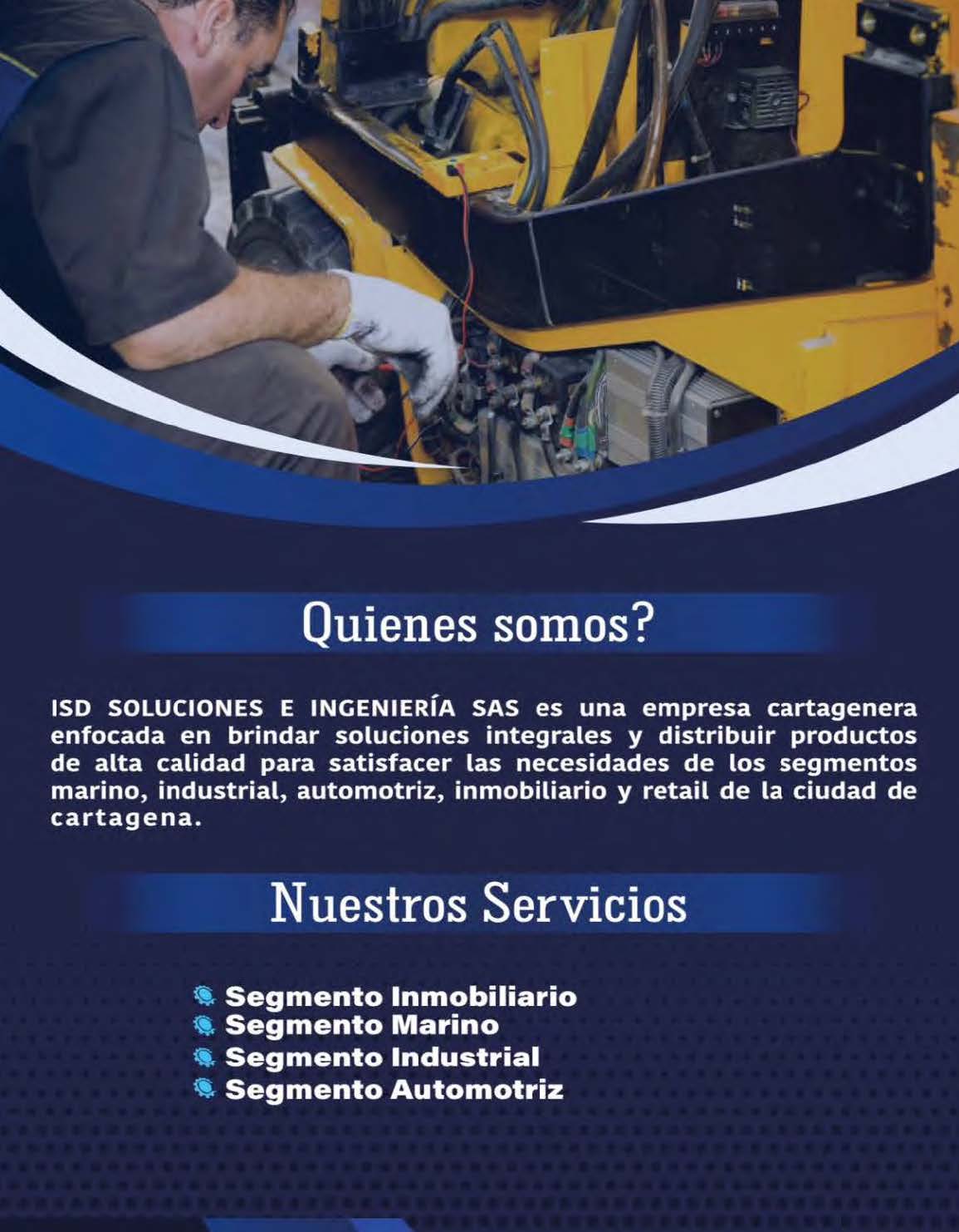Somos una empresa Cartagenera que presta servicios Integrales de Ingenieria. Comercializamos y vendemos las mejores marcas de lubricantes, grasas, refrigerantes y elementos Industriales. Prestamos servicios integrales para los segmentos; Inmobiliario, Industrial, Marino y Automotriz.